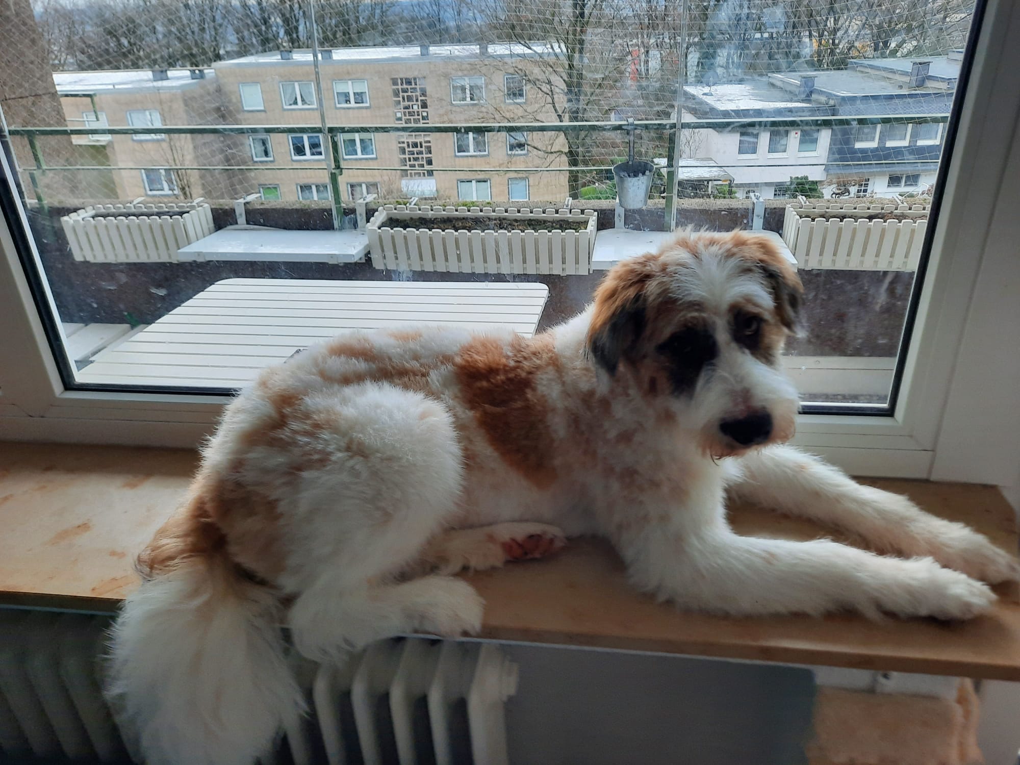 Ein rumänischer Herden- und Hirtenschutzhund, der überhaupt nicht dafür geeignet ist in der Stadt zu leben, kam in eine kleine Stadtwohnung mit Balkon .