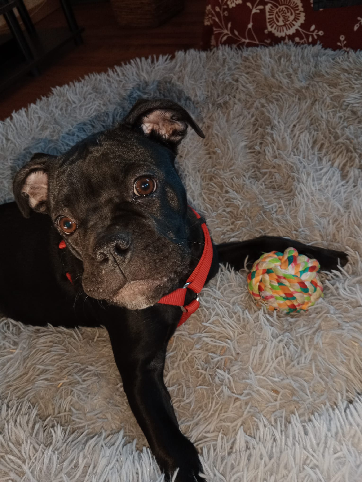 Ihre erwartete Erwachsenengröße lässt sich schwer voraussagen, da der Papa unbekannt ist. Sie ist mehrfach entwurmt, gechipt, geimpft und besitzt einen blauen Heimtierausweis. Ihre Mutter hat eine Ahnentafel von Deutschen Bulldogg- Club e.V.