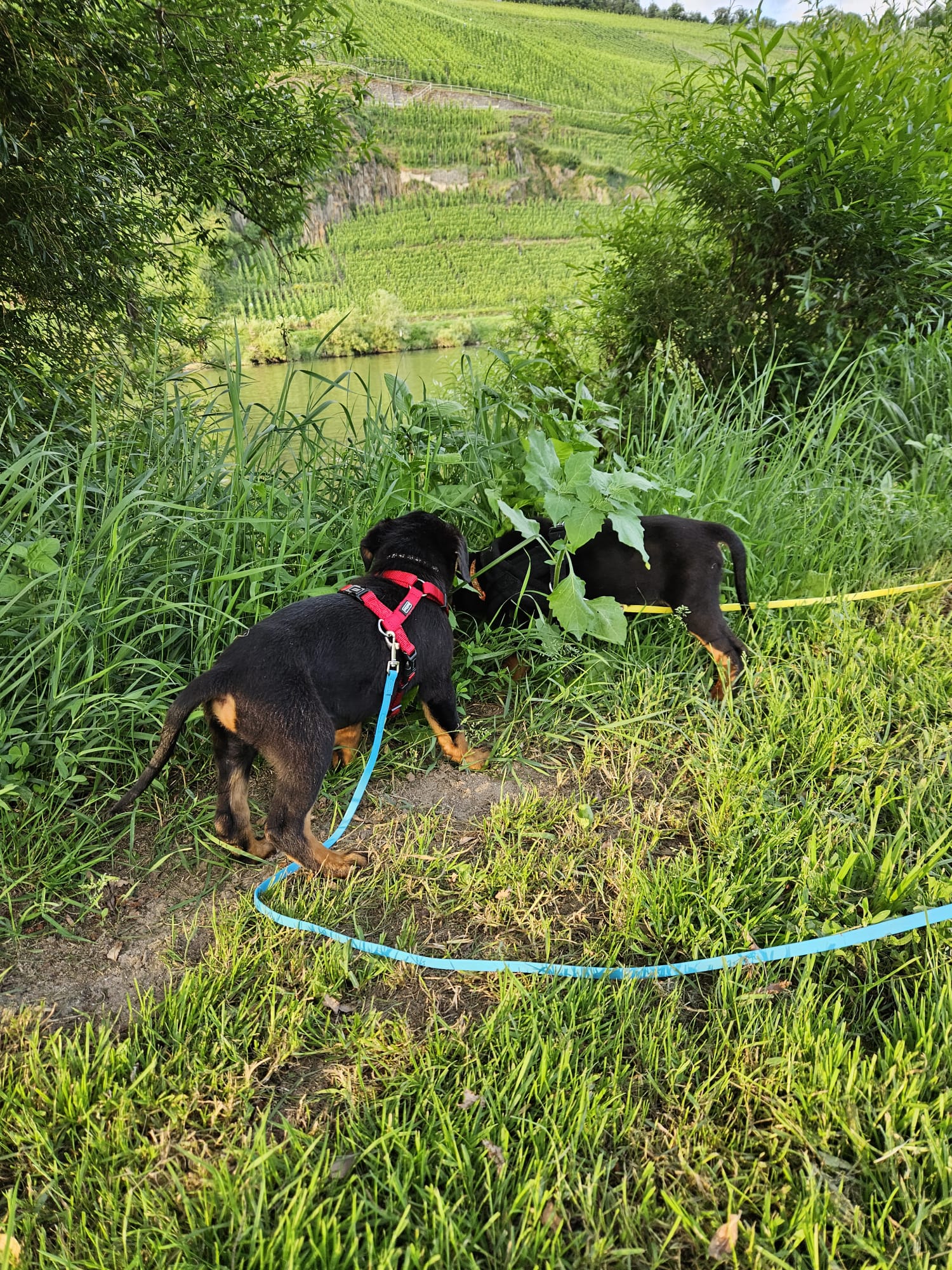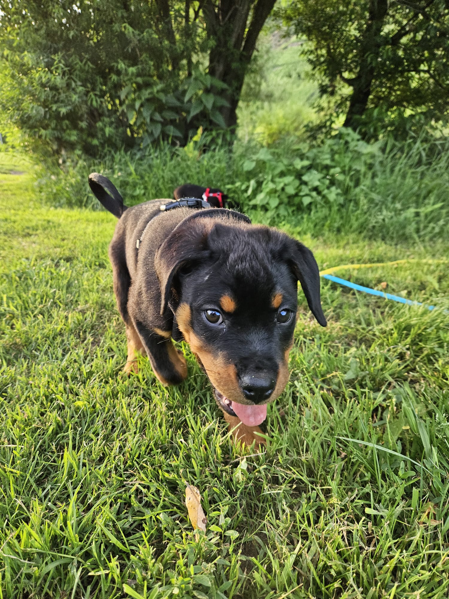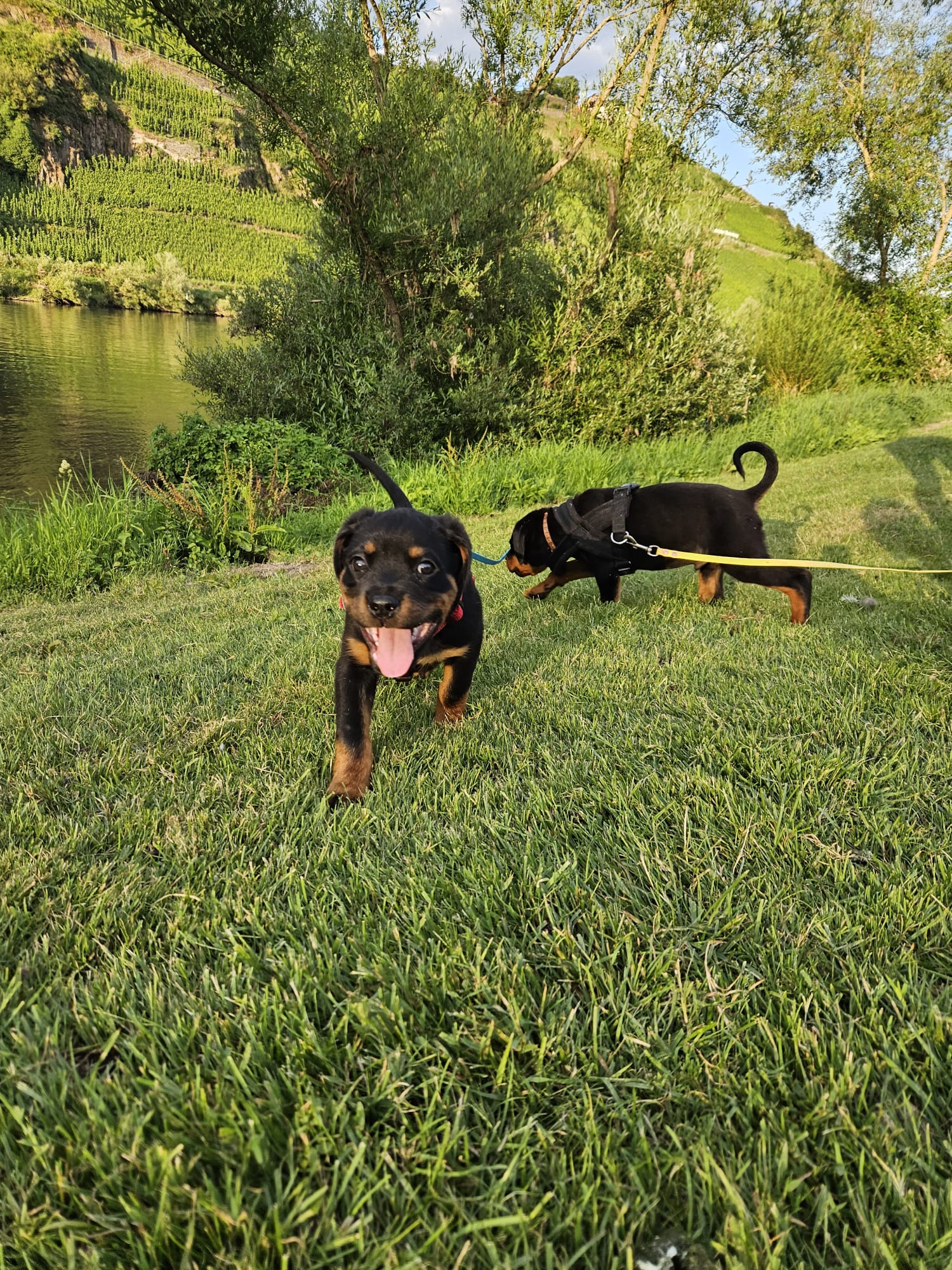unsere Pflegemama zeigt uns die Welt da draußen, und übt mit uns viele andere nützliche Dinge. Wir sind noch nicht stubenrein, aber das lernen wir noch.